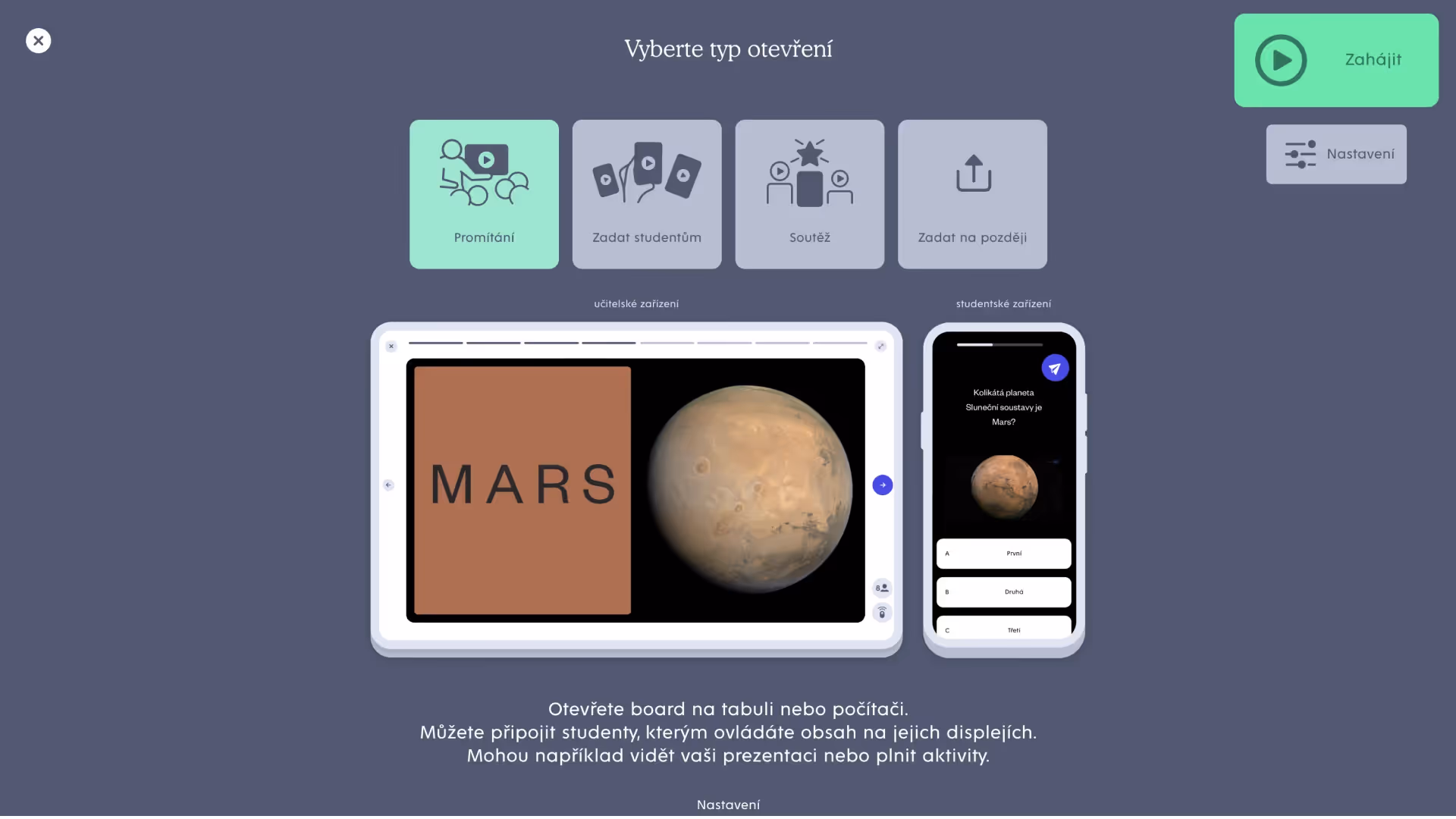 Tento mód umožňuje učiteli procházet lekci na interaktivní tabuli, přičemž žáci se mohou připojit pomocí svých zařízení, jako jsou telefony nebo tablety. Obsah prezentace se zobrazuje jak na tabuli, tak i na zařízeních žáků, což jim usnadňuje sledování výuky. Žáci mohou odpovídat na otázky v reálném čase a jejich odpovědi se zobrazují přímo na tabuli. Tento mód je ideální když učitel, potřebuje mít kontrolu nad tím, jak se žáci pohybují v prezentaci, a zároveň chtějí okamžitou interakci. Jednou z klíčových funkcí je, že když se žák kouká jinam a vyjede z prezentace, učiteli se na tabuli zvýrazní jméno neposedného žáka, což mu umožní okamžitě reagovat a udržet studenty soustředěné na výuku.