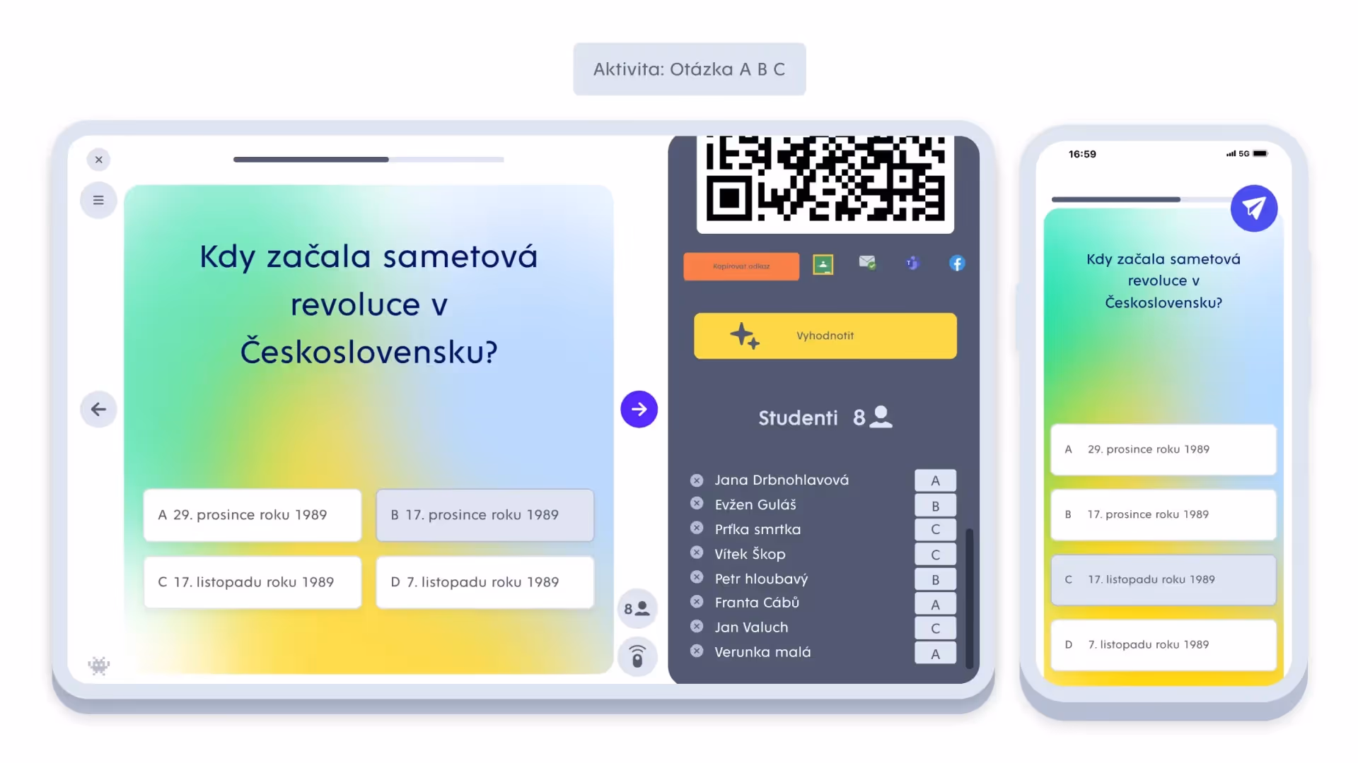 Následně mohou žáci odpovídat na otázky formou soutěže, kde za správné odpovědi sbírají body. Tento soutěžní mód jim pomáhá lépe se zapojit do výuky a motivuje je k pečlivému sledování prezentace. Učitel může také zadat žákům, aby si lekci zopakovali doma v módu "Zadat na později" a připravili si otázky k další diskusi. Tento přístup umožňuje propojit tradiční historický výklad s moderními interaktivními prvky, což činí hodiny dějepisu zábavnějšími a poutavějšími.