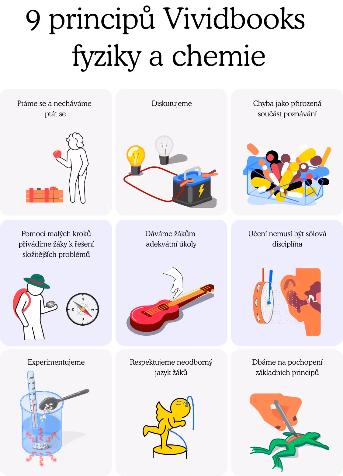 Když se podíváme na běžnou učebnici v dnešní škole, velmi pravděpodobně uvidíme, že její naprostou většinu tvoří text, který žákům předává informace nebo jim něco vysvětluje. A to mi vždycky přišlo hrozně málo. Ve Vividbooks se snažíme o to, aby učebnice vedla žáky k aktivitě. Formy se mohou (a měly by se) lišit. Jednou jsou lekce s otázkami k diskuzi, jindy série gradovaných matematických úloh, která vede žáky k objevení nějakého matematického principu. Vždy je ale na prvním místě žákova myšlenka.