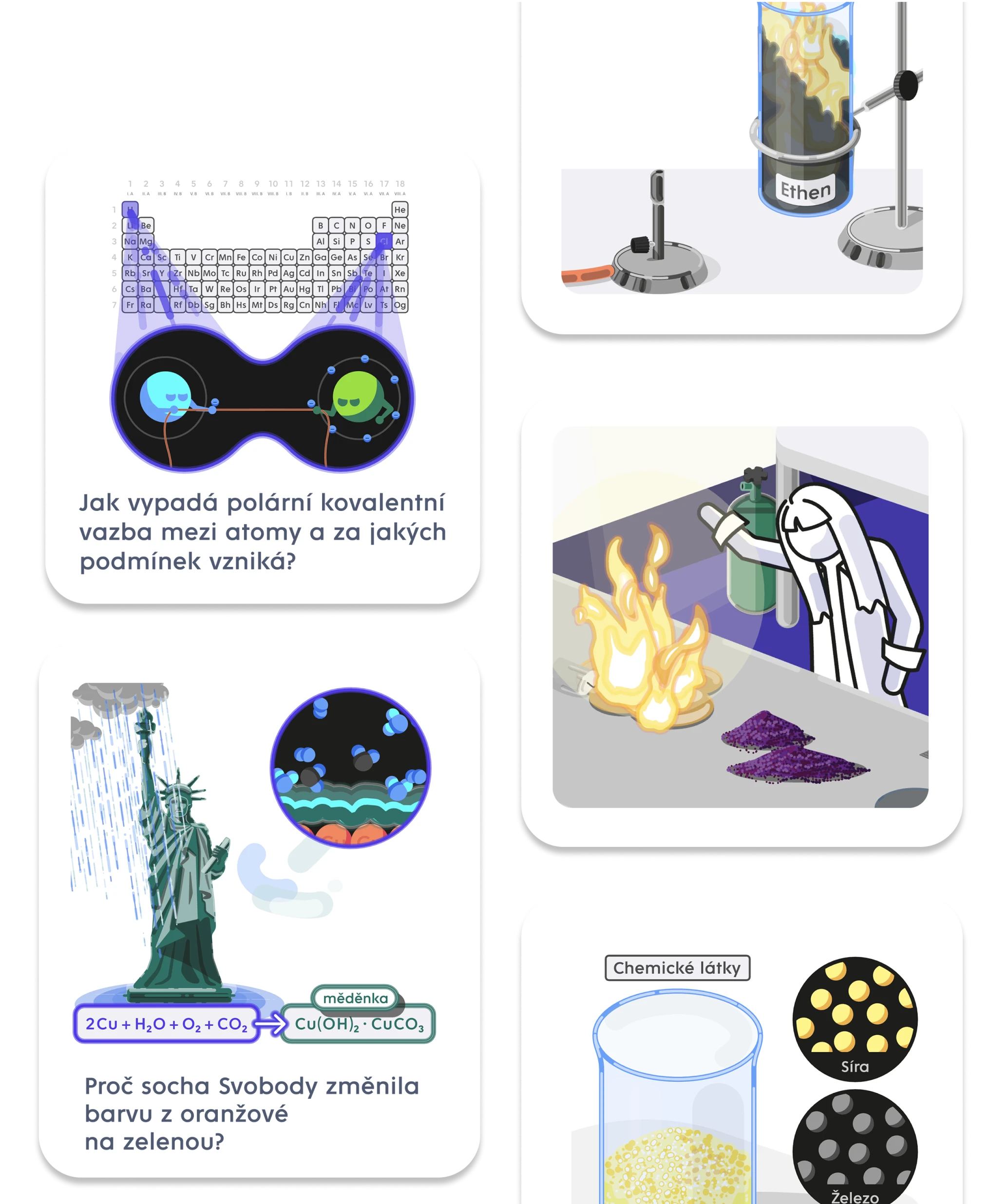Věříme, že výuka (nejen) chemie by neměla probíhat pouhým předáváním informací od vyučujícího směrem k žákům. Učebnici Vividbooks Chemie jsme proto navrhli tak, aby inspirovala žáky k aktivitě. Děti budou přemýšlet, řešit problémy a hledat vlastní odpovědi a argumenty. Více o metodických principech.